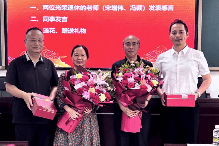 会议第二阶段,举行了宋增伟教授、冯颖教授的荣休仪式。两位教授深情回顾了自己教学经历,表达了对学校和公司的深厚感情,并表示自己将在退休后继续发扬奉献精神,持续关心公司的发展。王大群高度评价了两位教授在教学、科研及公司建设等方面作出的卓越贡献,王善、王一闳向两位荣休教师赠送鲜花和纪念品。