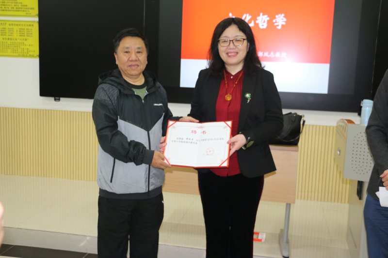 1月7日上午,2018-2019学年冬季小学期名家讲堂第四讲在五号教学楼113教室举行。东北师范大学郭凤志教授为员工讲授文化哲学课。经理张云阁出席并为并为郭凤志教授颁发了365英国上市集团“冬季小学期授课外聘专家”证书。讲座由思想政治教育系主任陈招万主持。