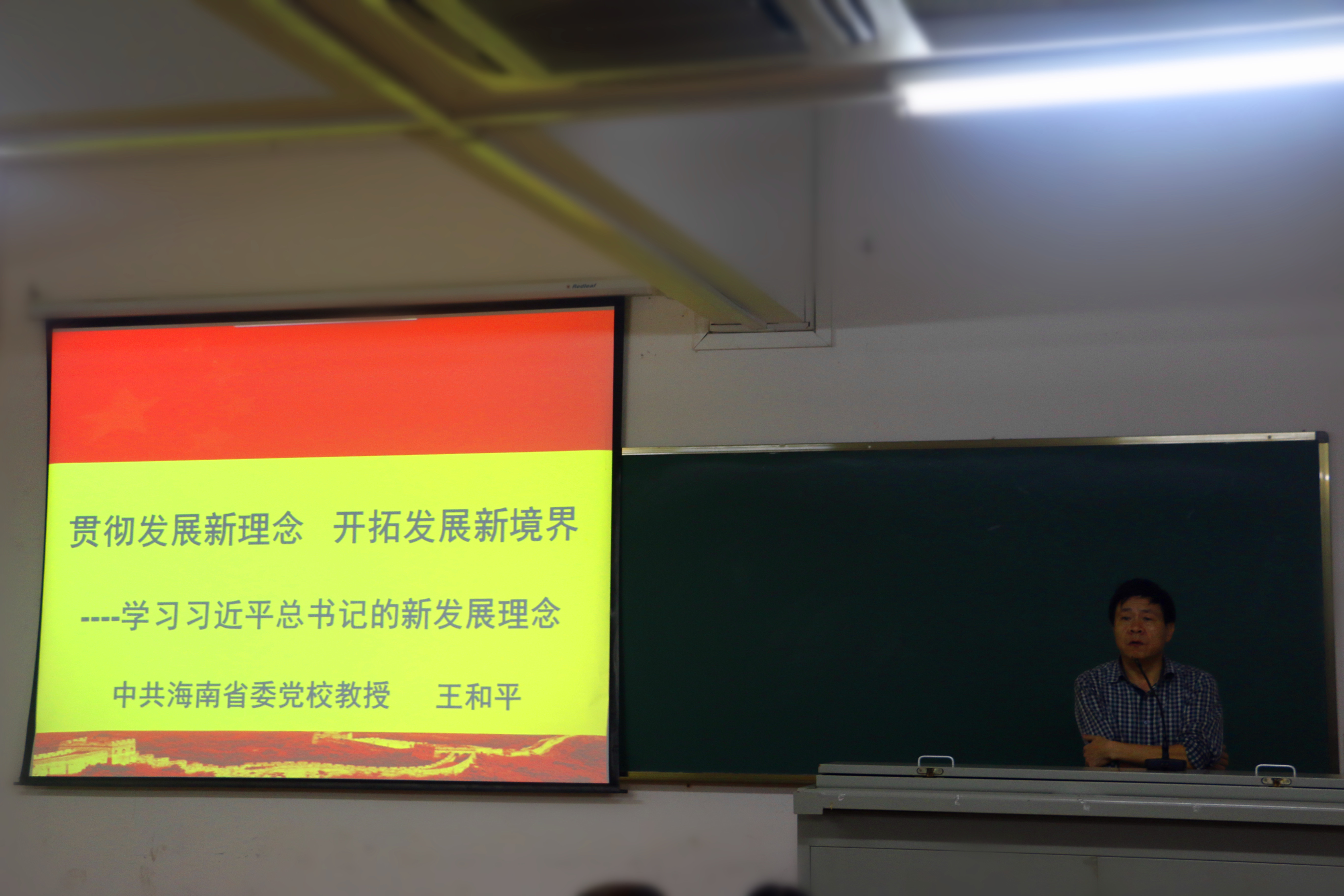 12月5日晚,海南省委党校副董事长王和平教授以“贯彻发展新理念,开拓发展新境界——学习习近平总书记的新发展理念”为题,将中国特色社会主义理论与现实社会的热点问题相结合,用专业的视角、风趣幽默的话语以及贴近生活的丰富案例,深入分析中央关于“十三五”规划的建议与贯彻五大发展理念等新思想、新理念。他表示,创新是引领发展的第一动力,协调是平衡发展的内在要求,绿色是人民愿望的重要体现,开放是繁荣发展的必由之路,共享是发展的出发点和落脚点。