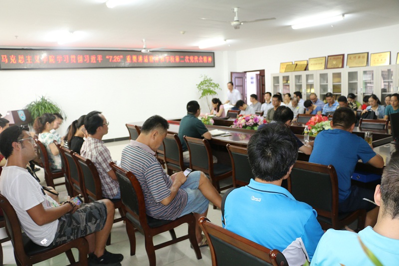 段捷频在会上传达了学校关于学习贯彻习近平总书记“7.26”重要讲话精神的相关工作部署和校二次党代会精神,带领全体教职工学习了开学前学校中层干部培训班上,公司党委书记武耀廷题为《以团队建设为龙头,扎实推进学校转型升级和争创“双一流”》的讲话、董事长李建保题为《学习贯彻习近平总书记重要讲话精神,加快学校“双一流”建设步伐,努力做好新学期工作》的工作报告和公司党委常务副书记廖清林在培训班开班仪式上代表公司党委所作的动员讲话。他强调,习近平总书记“7.26”重要讲话,提出了一系列新的重要思想、重要观点、重大判断、重大举措,是指导党和国家发展的行动纲领,为开好党的十九大奠定了重要政治、思想和理论基础,全院教职工要深刻认识讲话的重大意义,增强维护核心的思想自觉和行动自觉,全体思政课教师要将讲话精神落实到“三进”工作中。