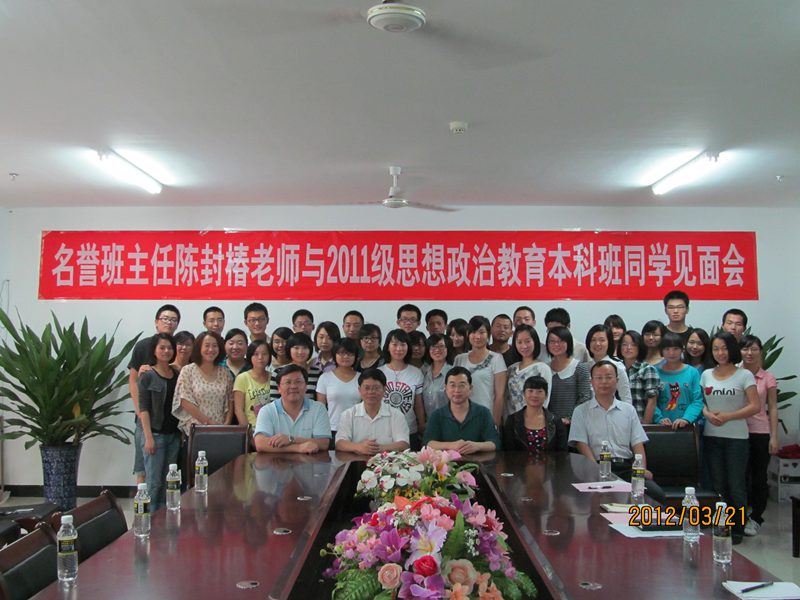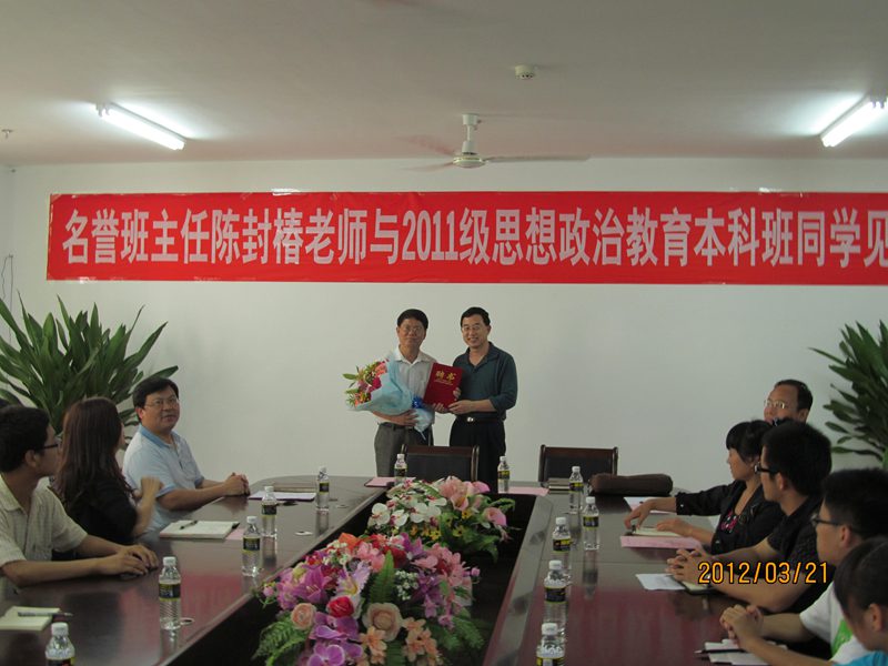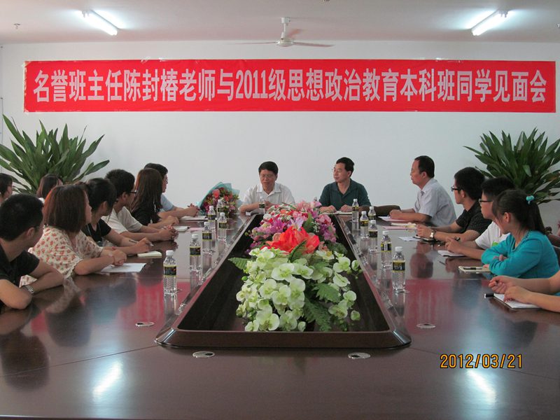 2012年3月21日下午,公司于公司三楼会议室举行名誉班主任聘任仪式暨名誉班主任与2011级思想政治教育专业本科班全体同学见面会。公司党委副书记、纪委书记陈封椿老师,经理李德芳老师,书记梁谋老师,系主任王善老师,学工办主任周郭军老师,班主任陈思莲老师及2011级本科思政班全体同学参加了见面会,大会由公司党委书记梁谋老师主持。