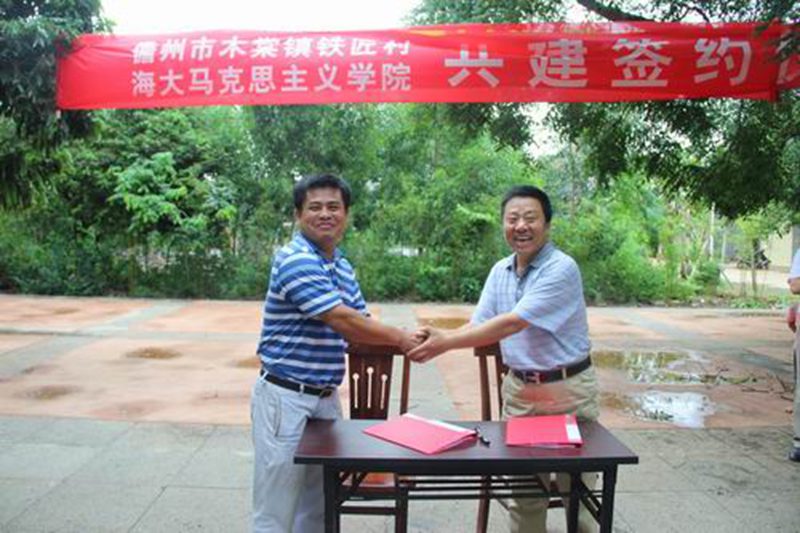 下午1点,社会实践教学队伍到达了享誉海内外的“一村一品”社会主义新农村典范——儋州市木棠镇铁匠村。在铁匠村的文化广场,铁匠村的李巨川主任介绍了铁匠村的基本情况,张云阁副经理在讲话中感谢铁匠村对老员工实践教学活动的大力支持,并对同学们的参观考察提出了具体要求。随后,张云阁副经理与李巨川主任共同签定了“365英国上市集团思想政治理论课铁匠村社会实践教学基地共同建设协议”,并为基地揭牌。在铁匠村的会议室,张云阁副经理还接受了海南旅游卫视的采访。