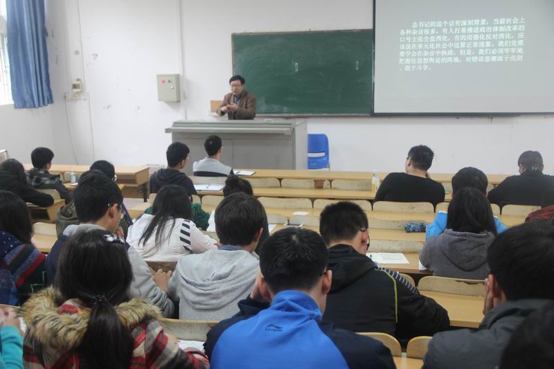 徐教授从“重新对新时期的基本认识”、“高等学校意识形态领域呈现从来没有过的良好态势”、“目前我国高等学校内在意识形态问题上仍然杂音不绝”三个方面对如何正确引导高校意识形态走向进行了精彩的解读。他结合自身经历,从时间和空间两个角度对新时期意识形态的认识做了详细的分析;他认为,随着党对高校领导的不断加强,高校逐渐把培育和践行社会主义核心价值观融入到教书育人的过程之中,近些年来,高校意识形态领域呈现良好态势;但与此同时,我国高校内在意识形态仍存在问题,反历史唯物主义、倡导新自由主义等所谓普世价值的意识形态问题充斥着校园。徐教授讲课中强调,我们必须牢牢把握思想舆论的阵地,对错误思潮要敢于亮剑、敢于斗争,大力发展精神文明建设,以确保中国特色社会主义事业顺利推进。
