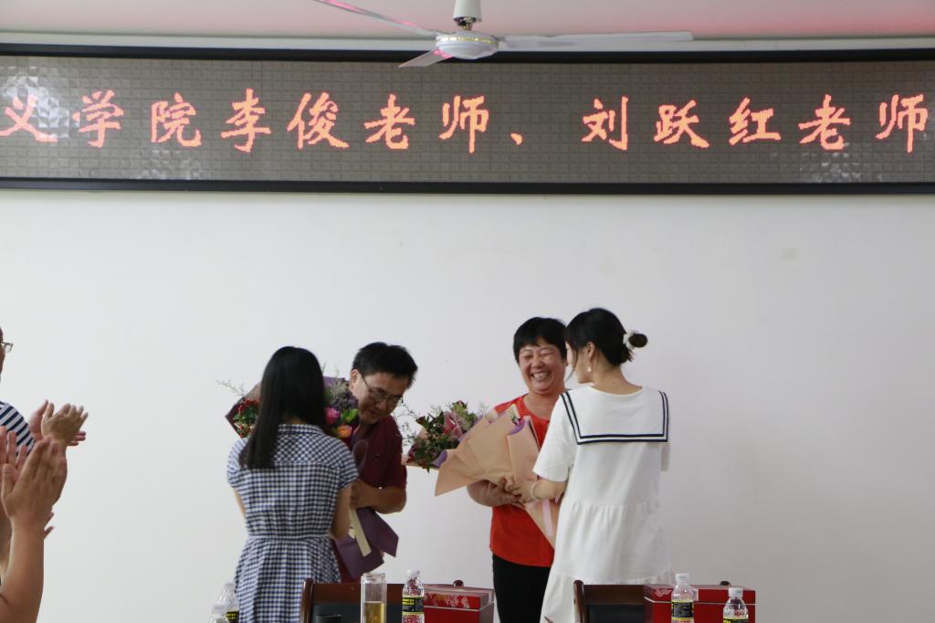 张云阁经理、段捷频书记为两位教师颁赠了公司特别定制的纪念品,员工代表为两位教师献花并合影留念。