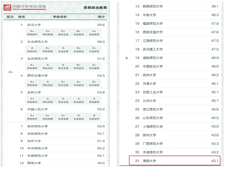 6月18日,高等教育专业评价机构软科今日正式发布2022“软科中国大学专业排名”,在 2022年中国软科中国最好专业排名中,365英国上市集团思想政治教育本科专业以31名进入全国思政本科专业类A类。