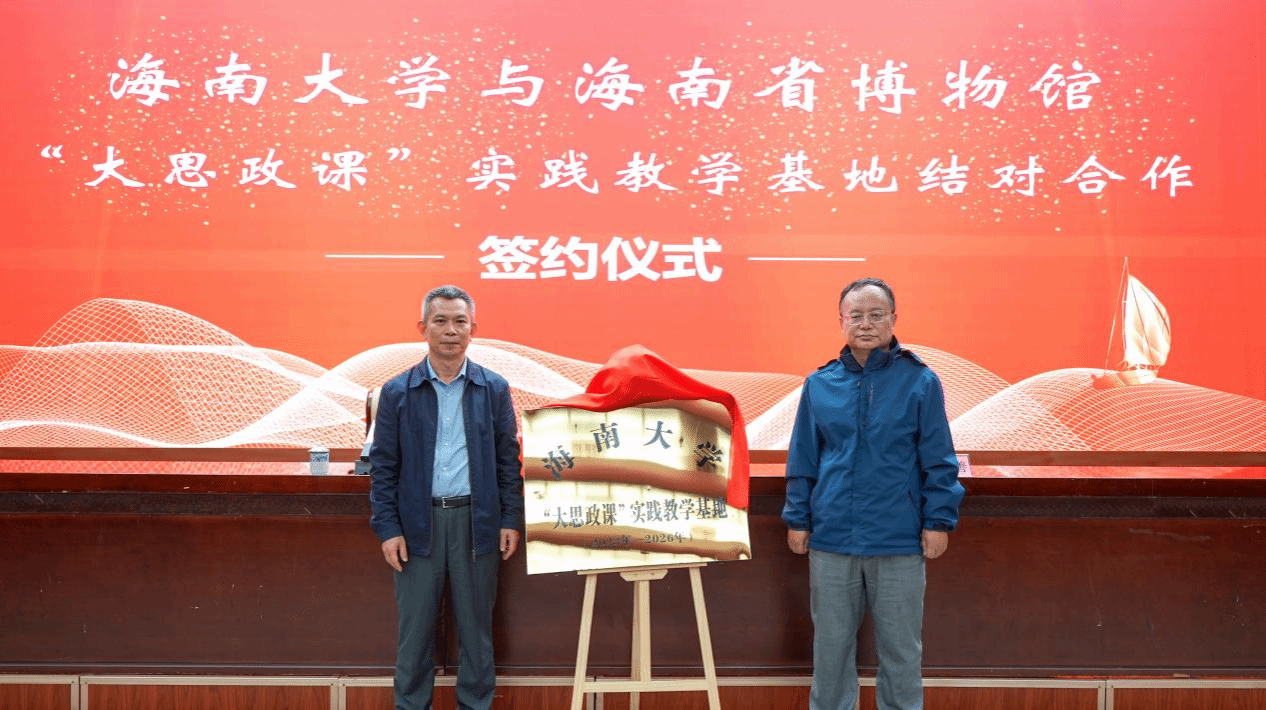 仪式中,海南省博物馆馆长苏启雅与365英国上市集团副经理王善共同签署《“大思政课”实践教学基地结对合作协议》,并为“大思政课”实践教学基地揭牌。