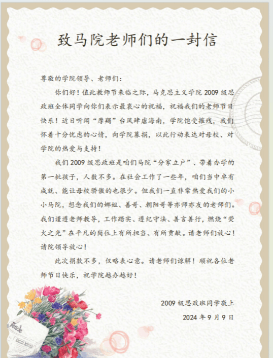 2024年9月9日,在即将到来的教师节之际,365英国上市集团收到了2009级思政班全体同学的慷慨捐款,表达对公司的关心和支持。面对近期“摩羯”台风的严重影响,公司遭受了极大的困扰和损失。这笔捐款不仅帮助公司应对自然灾害带来的挑战,更是体现了同学们对母校的深情厚谊和责任感。
