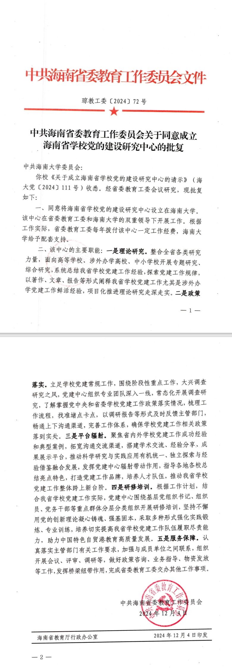 中共海南省委教育工作委员会关于同意成立海南省公司党的建设研究中心的批复
